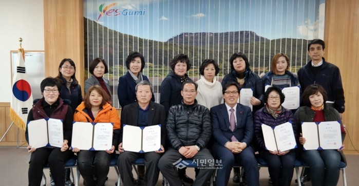 경북 구미시 인동동은 지난 4일 주민센터 다목적 회의실에서 통장협의회 회장 및 임원진이 참석한 가운데 신임 2명, 재위촉 5명의 통장에게 위촉장을 수여했다. 사진은 행사에 참석한 관계자들이 기념촬영을 하는 모습.(사진제공=구미시청)