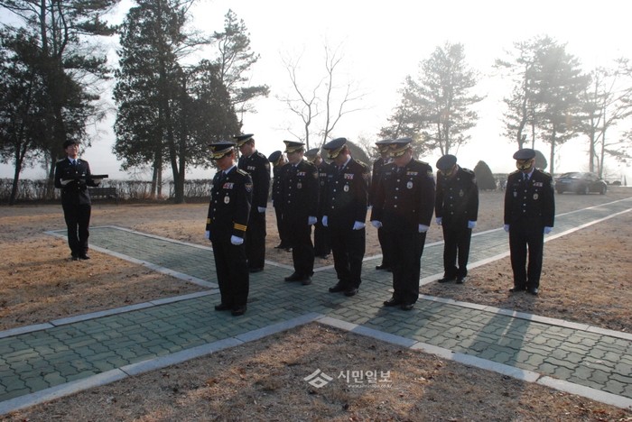 경기 연천경찰서는 지난 4일 연천읍 소재 현충탑과 3층 강당에서 각 과·계장 및 직원 등이 참석한 가운데 '2016년 시무식' 행사를 진행했다. 사진은 현충탑에서 경찰서 관계자들이 새해맞이 참배를 하는 모습.(사진제공=연천경찰서)