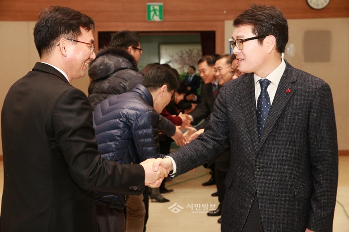 지난 4일 성동구는 병신년(丙申年) 새해를 맞아 구청 3층 대강당에서 '2016 성동가족과 소통하는 시무식'을 개최했다. 사진은 정원오 구청장(오른쪽)이 구청 직원들과 악수하는 모습.(사진제공=성동구청)