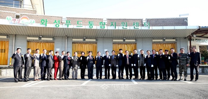 지난 5일 경기 화성시는 재단법인 화성푸드통합지원센터 현판식을 진행했다. 사진은 행사에 참석한 채인석 시장(가운데)을 비롯한 관계자들이 기념촬영을 하는 모습.(사진제공=화성시청)