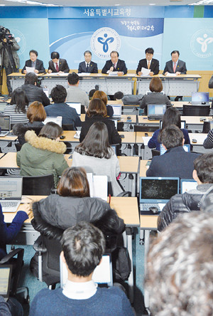 6일 오후 서울시교육청 브리핑실에서 열린 전국 시도교육감협의회 누리과정 예산 입장 발표 기자회견에서 장휘국 광주시교육감이 모두발언을 하고 있다. 왼쪽부터 조희연 서울시교육감, 김승환 전라북도교육감, 이재정 경기도교육감, 장휘국 광주시교육감, 이청연 인천시교육감, 민병희 강원도교육감.