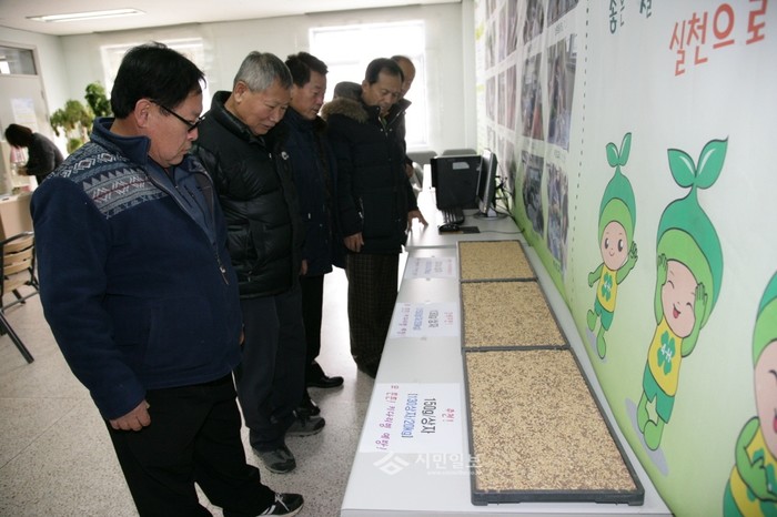 경기 양주시농업기술센터는 식량작물반을 시작으로 오는 2월까지 ‘2016년 새해농업인 실용교육’을 진행한다. 사진은 지난 6일 교육에 참석한 관계자들이 전시된 볍씨파종을 관찰하는 모습.(사진제공=양주시청)