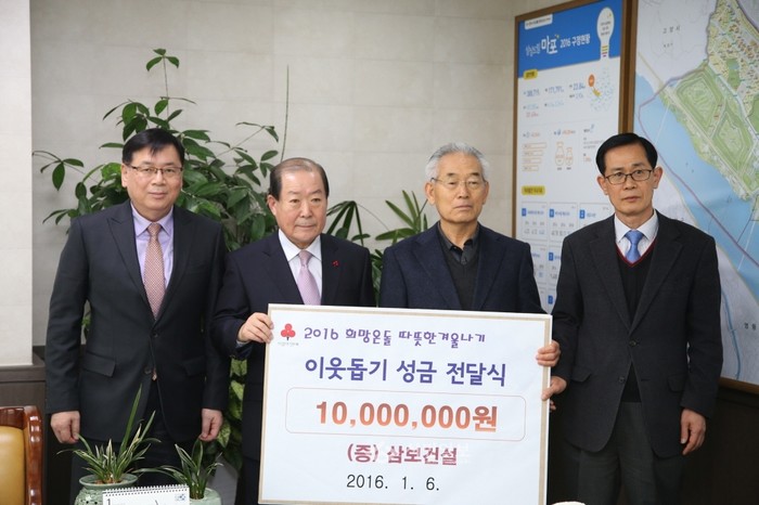 지난 6일 서울 마포구청에서 삼보건설 박춘규 대표(오른쪽에서 두 번째)가 따뜻한 겨울나기를 위한 이웃돕기 성금으로 1000만원을 기탁하고 박홍섭 마포구청장(왼쪽에서 두 번째) 등 관계자들과 기념촬영을 하고 있다.(사진제공=마포구청)