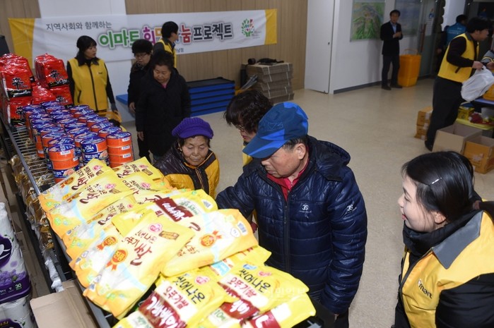 경기 하남시 푸드뱅크는 7일 하남시진로직업 체험지원센터에서 ‘희망배달마차’ 행사를 진행했다. 사진은 행사에 참석한 관계자들이 물품을 고르는 모습.(사진제공=하남시청)