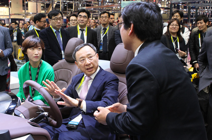 | ▲ 6일(현지시간) 미국 라스베이거스에서 시작된 CES 2016 기아차 전시관을 찾은 KT 황창규 회장이 자율주행 신기술을 체험하고, 관계자로부터 설명을 듣고 있다. | ||