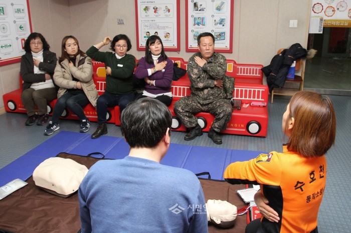 동작소방서는 지난 7일 오후 2시 소방서 3층 소방안전체험교실에서 국군복지단 서울지구대 지구대장 등을 대상으로 '심폐소생술 체험교육'을 실시했다. 사진은 관계자들이 심폐소생술 교육을 받는 모습.(사진제공=동작소방서)