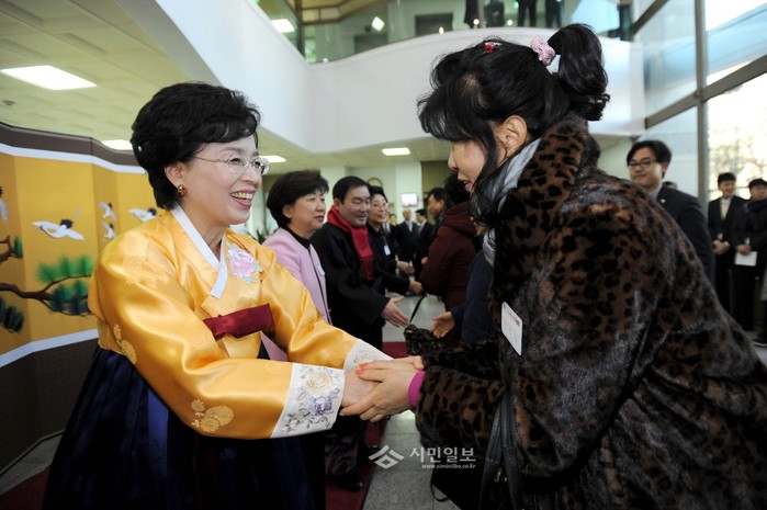 송파구는 지난 7일 송파구민회관에서 '신년인사회'를 진행했다. 사진은 행사에 참석한 박춘희 구청장(왼쪽)이 주민들과 새해 인사를 나누는 모습.(사진제공=송파구청)