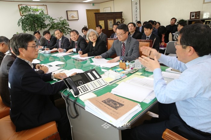 경기 광명시는 최근 시청 회의실에서 '2016년도 업무보고'를 진행했다. 사진은 양기대 시장(오른쪽)이 직원들에게 업무보고를 듣고 관련 사항을 지시하는 모습.(사진제공=광명시청)