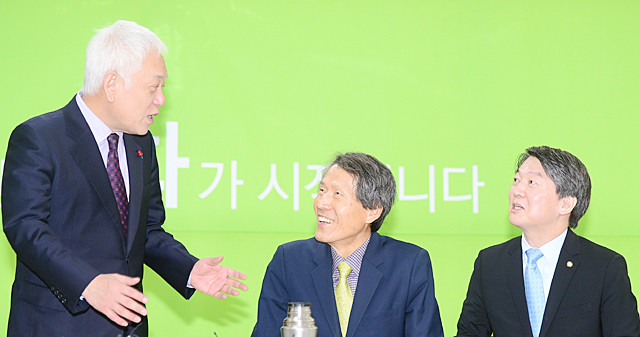 한상진(가운데)교수가 8일 오전 서울 마포구 무소속 안철수 의원 당사 대회의실에서 열린 창당준비점검회의에 앞서 김한길(왼쪽)의원, 안 의원과 대화를 나누고 있다.