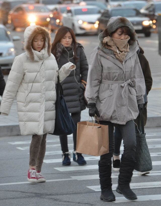 서울 기온이 -7도를 기록해 올 겨울들어 가장 추운 날씨를 보이는 8일 오전 서울 종로구 세종로 사거리에서 시민들이 출근을 서두르고 있다.
