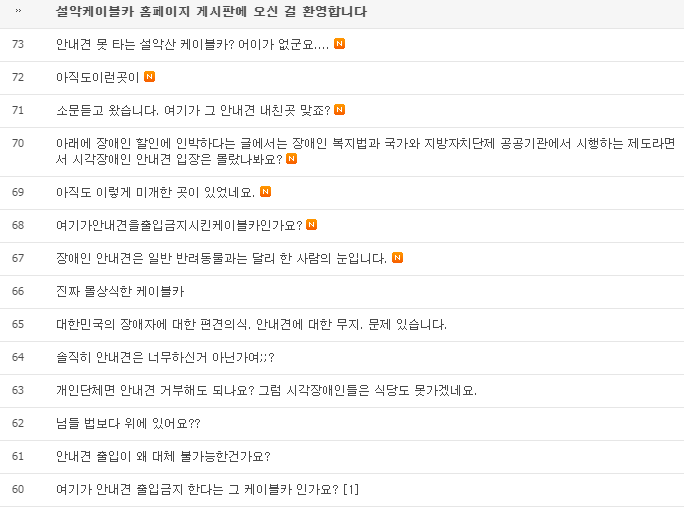 이같은 논란은 안내견 동승을 거절당한 시각장애인의 가족 A씨가 한 커뮤니티 사이트에 설악산케이블카 업체의 부당한 행태를 알리는 글을 올리면서 벌어졌다. 현재 설악산케이블카 홈페이지는 케이블카측을 비판하는 글이 쇄도하고 있다.