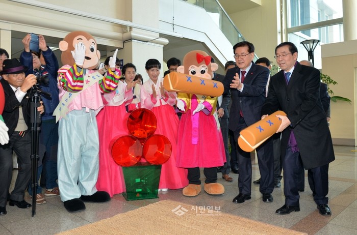 동대문구는 지난 7일 구청 강당에서 '2016년 동대문구 신년인사회'를 개최했다. 사진은 행사에 참석한 유덕열 구청장(오른쪽에서 두 번째)이 박원순 서울시장과 함께 대형 윷을 던지는 모습.(사진제공=동대문구청)