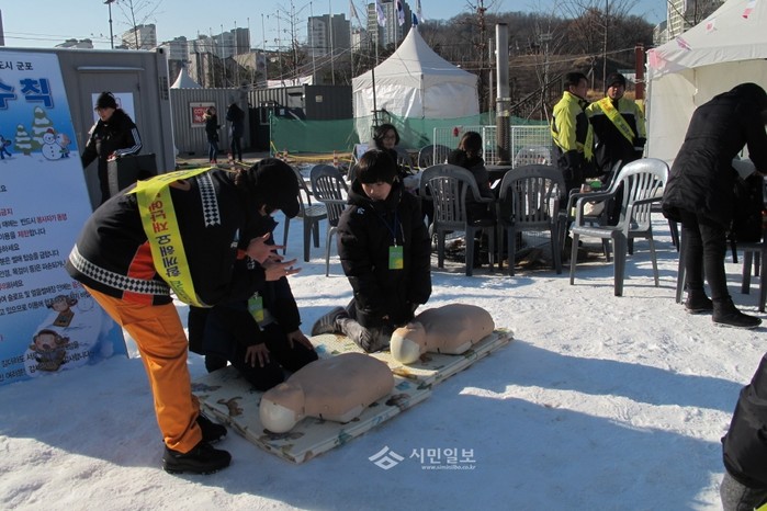 경기 군포소방서는 지난 8일 당동2지구 체육공원에서 안전점검의 날 행사와 함께 참여 단체와 시민들을 대상으로 주택기초소방시설 홍보를 진행했다. 사진은 행사에 참석한 관계자들이 심폐소생술 교육을 받는 모습.(사진제공=군포소방서)