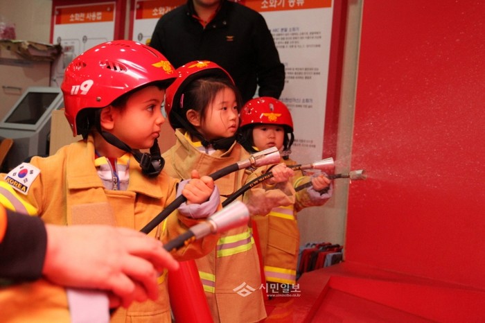 서울 동작소방서는 지난 8일 오전 10시 소방서 3층 소방안전체험교실에서 숭실대직장어린이집 원아 30여명에게 소방안전교육을 실시했다. 사진은 어린이들이 소화기 사용 실습을 하는 모습.(사진제공=동작소방서)