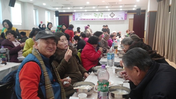 서울 중랑구 망우본동 주민센터는 지난 8일 오전 11시30분 망우본동복합청사 5층 강당에서 지역내 노인 500여명을 초대해 사골떡국을 제공했다. 사진은 행사에 참석한 노인들이 떡국을 먹는 모습.(사진제공=중랑구청)