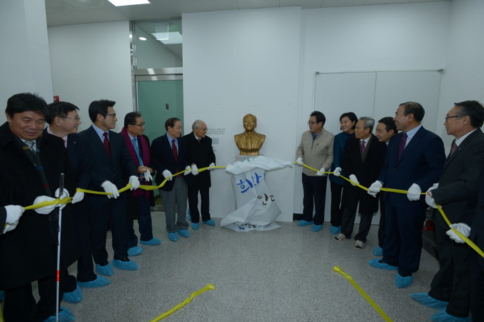 | ▲ 김선교 군수(오른쪽에서 여섯번 째)를 비롯한 관계자들이 강영우 박사 흉상 제막식을 진행하고 있다. | ||