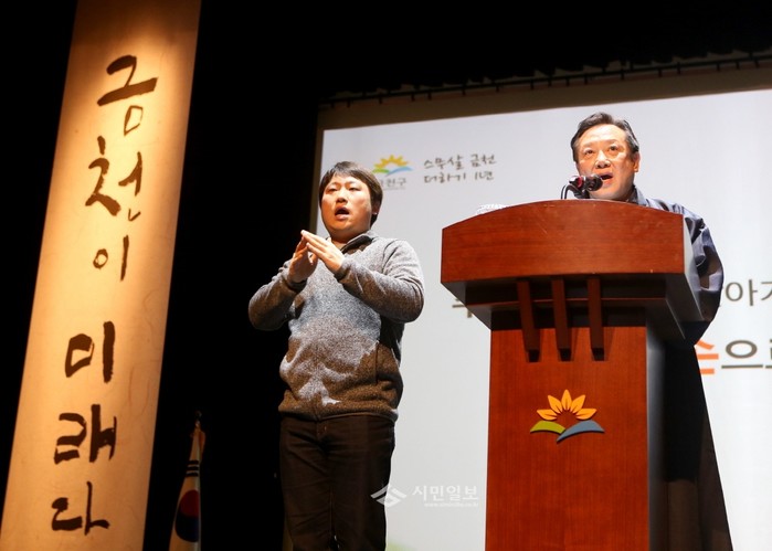 지난 11일 금천구는 오후 2시 구청 금나래아트홀 공연장에서 '2016년 신년인사회'를 개최했다. 사진은 행사에 참석한 차성수 구청장(오른쪽)이 신년사를 하는 모습.(사진제공=금천구청)