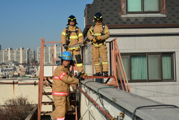 동작소방서는 지난 11일 오후 1시 대방동에 위치한 '학원 현지적응훈련'을 실시했다. 사진은 훈련에 참가한 소방서 관계자들이 화재 발생시 진입경로, 대피경로 등을 확인하는 모습.(사진제공=동작소방서)
