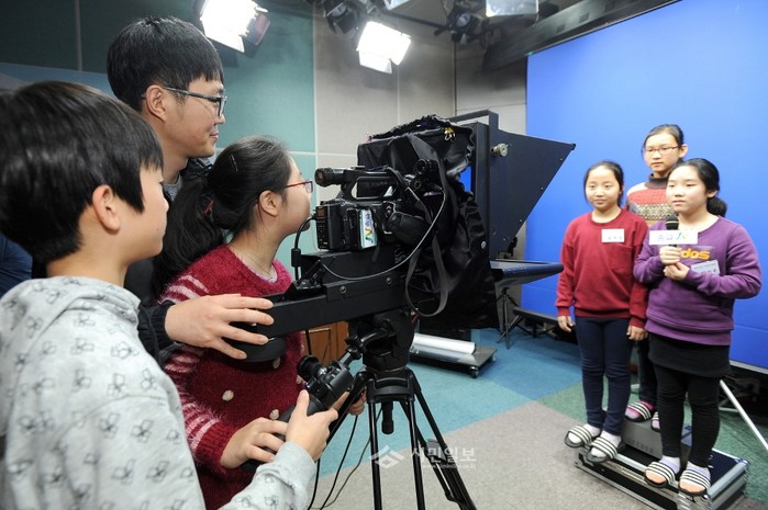 12일 겨울방학을 맞아 서울 송파구가 마련한 '어린이 방송아카데미'에 참가한 어린이들이 송파구청 인터넷 방송국에서 방송제작 체험 및 방송카메라 촬영법을 배우고 있다.(사진제공=송파구청)