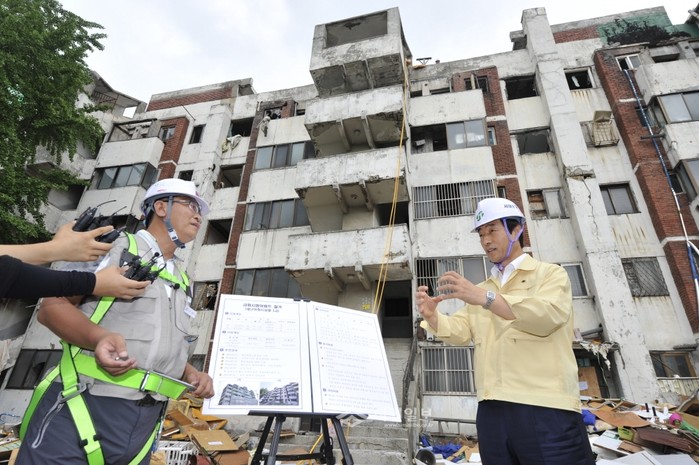 | ▲ 문 구청장(오른쪽)이 금화시범아파트 철거 공사현장을 찾아 공사 관계자로부터 현황 보고를 받고 있다. | ||