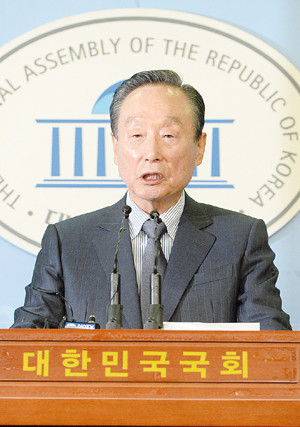 동교동계 좌장인 권노갑 더불어민주당 상임고문이 12일 오전 서울 여의도 국회 정론관에서 기자회견을 열고 55년간 몸담은 당을 떠나겠다고 선언하고 있다.