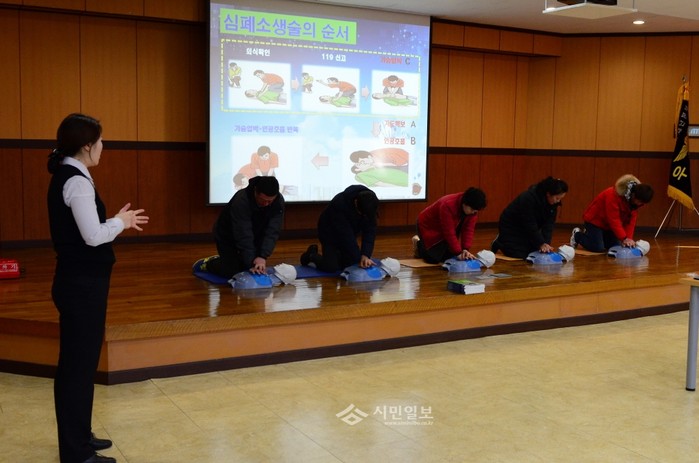 영등포소방서는 지난 11일 오후 소방서 4층 강당에서 다중이용업소 영업주 및 관계자들을 대상으로 '소방안전교육'을 실시했다. 사진은 교육에 참석한 관계자들이 심폐소생술 실습을 하는 모습.(사진제공=영등포소방서)