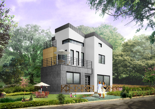 1층에는 안방, 욕실, 거실, 주방, 테라스, 2층에는 작은방2칸, 욕실, 테라스, 3층에는 다락방과 테라스가 구성되며, 주차대수 2대까지 가능하다.