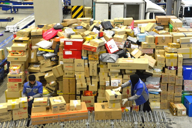 민족의 대명절 설날이 한 달도 채 남지 않은 13일 오전 서울 송파구 장지동 현대로지스틱스 동남권 물류센터에서 택배사 직원들이 가득 싸인 물품들을 분류하고 있다.