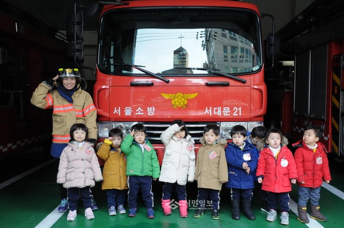 서대문소방서는 지난 13일 '꿈하은어린이집' 원아들을 대상으로 '어린이안전교육'을 실시했다. 사진은 교육에 참석한 어린이들이 기념촬영을 하는 모습.(사진제공=서대문소방서)