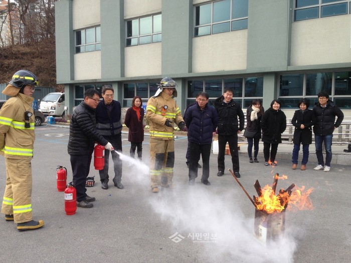 지난 13일 경기 이천시 관고동 주민센터는 이천소방서와 함께 대피훈련 및 소화기 사용방법 등에 대한 '소방합동훈련'을 실시했다. 사진은 교육에 참석한 관계자들이 소화기 사용 실습을 하는 모습.(사진제공=이천시청)