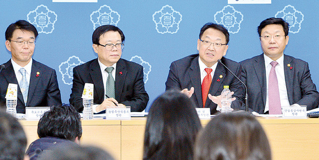 유일호 경제부총리 겸 기획재정부 장관(오른쪽에서 두번째)이 14일 오후 정부세종청사 기재부 브리핑룸에서 열린 ‘2016 경제부처 업무보고 관계부처 합동브리핑’에서 내수·수출의 균형을 통한 경제활성화 방안을 발표하고 있다.