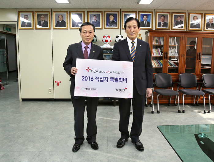 15일 서울 서대문구의회가 오전 11시 구의회 의장실에서 2016년 적십자 특별회비(30만원) 전달식을 개최한 가운데 류상호 의장(사진 왼쪽)과 대한적십자사 서울지사 제타룡 회장이 기념촬영을 하고 있다. (사진제공=서대문구의회)