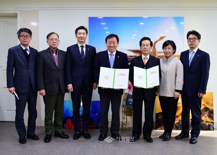 경기 안산시는 지난 14일 그동안 많은 우여곡절을 겪었던 사동 90블록 복합개발사업의 본격적인 추진을 위해 협약당사자인 GS건설컨소시엄과 실시협약을 체결했다. 사진은 제종길 시장(가운데)과 관계자들이 기념촬영을 하는 모습.(사진제공=안산시청)