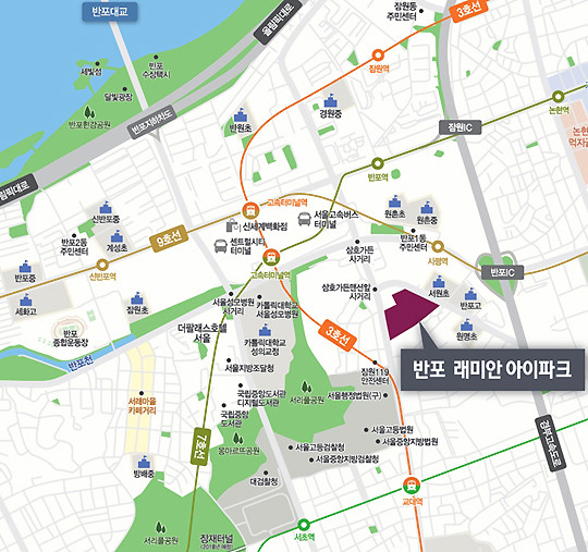 ‘반포 래미안 아이파크’는 탁월한 쾌속교통을 자랑한다. 9호선 사평역이 도보 5분 거리에 위치하고 있으며, 3·7·9호선이 만나는 교통의 요지 고속버스터미널역은 물론 반포역, 교대역 등이 1km 거리에 위치해있다. 여러 버스노선이 지나는 고무래로와 서초중앙로도 인접해 있으며, 자가용 이용자들에게는 반포 IC가 지근거리라 서울 각지, 전국 각지로의 이동이 쉽고 빠르다.