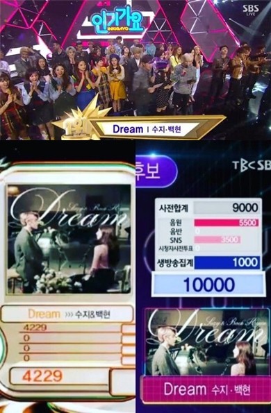 한편 수지와 백현의 듀엣곡 '드림'은 17일 오후 서울 등촌동 SBS 공개홀에서 생방송으로 진행된 '인가'에서 1위에 올랐다.