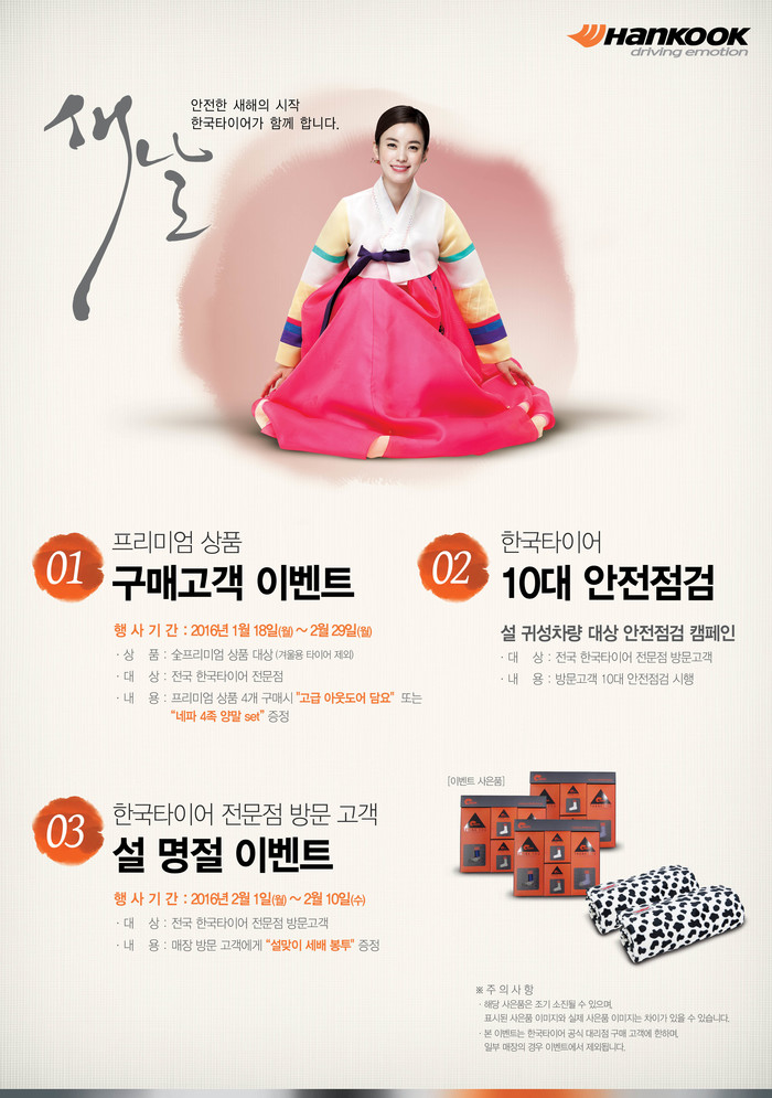 한국타이어는 프리미엄 타이어를 4개 이상 구매한 고객들에게 고급 아웃도어 담요 또는 양말 세트를 증정한다. 또한 2월 1일부터 10일까지 ‘설 명절 이벤트’도 함께 진행되어 일반 타이어를 구매하거나 안전점검을 시행한 고객들에게 고급 세배 봉투가 제공된다.