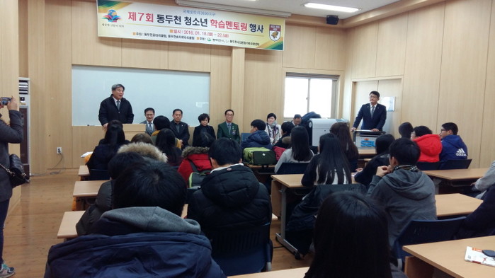 경기 동두천로타리클럽에서는 오는 22일까지 신흥재단 국제센터에서 청소년 학습 멘토링 교육을 실시한다. 사진은 지난 18일 개강식에 참석한 오세창 시장(앞줄 맨 왼쪽)이 인사말을 하는 모습.(사진제공=동두천시청)