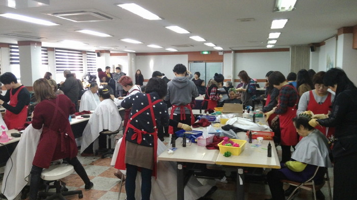 지난 19일 경기 안산시 선부2동은 동주민센터에서 이·미용 봉사를 진행했다. 사진은 봉사에 참석한 관계자들이 노인들의 머리를 손질하는 모습.(사진제공=안산시청)