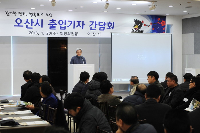 경기 오산시는 20일 오산 웨딩의 전당에서 '오산시 출입기자단 신년간담회'를 개최했다. 사진은 행사에 참석한 곽상욱 시장이 인사말을 하는 모습.(사진제공=오산시청)