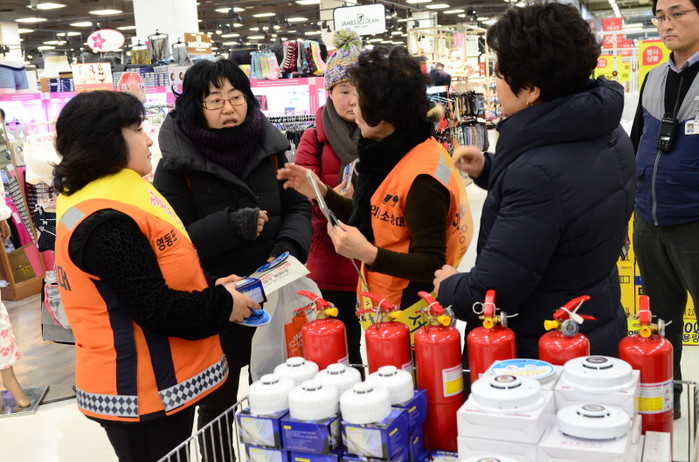 지난 10일 서울 영등포소방는 홈플러스 영등포점에서 소방공무원 및 의용소방대와 홈플러스 관계자가 쇼핑객을 대상으로 기초소방시설 설치 의무화 안내 및 홍보를 실시했다. 사진은 소화기 사용 체험이 진행되는 모습.(사진제공=영등포소방서)