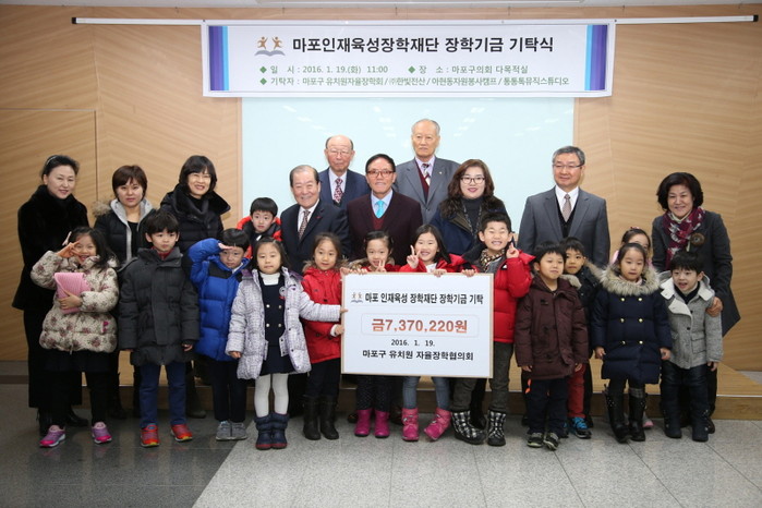지난 19일 마포구에 있는 유치원 원아들과 원장들이 모은 성금 737만220원을 ‘마포인재육성장학재단’에 전달했다. 박홍섭 구청장(오른쪽에서 다섯 번째) 등 관계자들이 어린이들과 기념촬영을 하는 모습.(사진제공=마포구청)