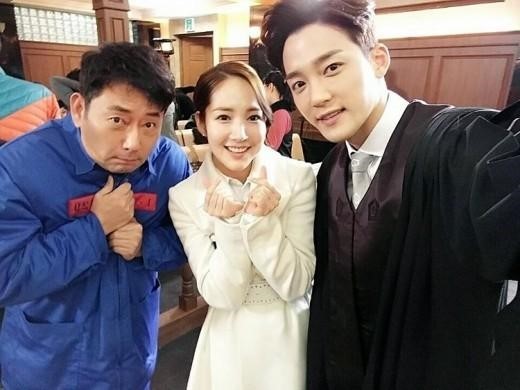 사진 속 김진우는 단정한 스타일의 판사복을 입고 전광렬,박민영과 환한 미소를 지으며 화기애애한 촬영장 분위기를 나타내고 있다.