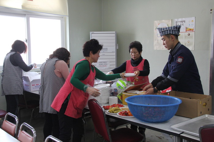 20일 충남 아산경찰서 의경어머니회는 충남지방경찰청 기동 1중대 식당에서 아산서 직원들과 의경 대원들을 대상으로 떡국 나눔 행사를 진행했다. 사진은 관계자들이 음식을 준비하는 모습.(사진제공=아산경찰서)