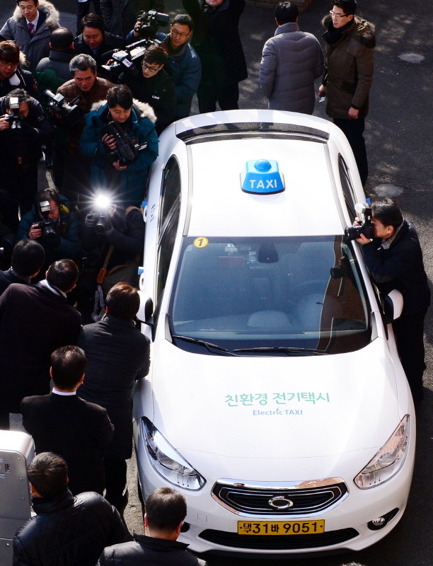 전기택시 시범보급 사업을 위한 시승식이 열린 20일 오전 대구 수성구 교통연수원에서 권영진 대구시장을 비롯한 이동희 시의회 의장 등 내빈이 전기택시 충전 시범을 보이고 있다.