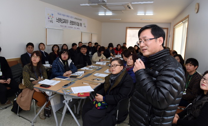 노원구는 지난 19일 오후 4시 영축산 숲속의 집에서 노원혁신교육지구의 사업방향과 사업구상을 위한 ‘노원혁신교육지구 운영협의체 워크숍’을 개최해 김성환 구청장(오른쪽)이 토론을 진행하고 있다.(사진제공=노원구청)