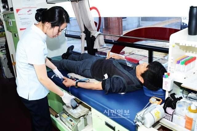 | ▲ 지난 20일 오후 2시 인천 부평구청 광장 헌혈차에서 진행된 대한적십자사의 '생명나눔, 사랑의 헌혈행사'에 동참한 박종혁 부평구의장이 헌혈 하는 모습.(사진제공=부평구의회) | ||
