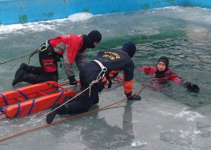 인천 부평소방서 119구조대는 21일 인천소방안전학교 수난교육 훈련장에서 생활구조대원과 함께 동계 수난사고 대비 인명구조 훈련을 실시했다. 사진은 훈련이 진행 중인 모습.(사진제공=인천부평소방서)