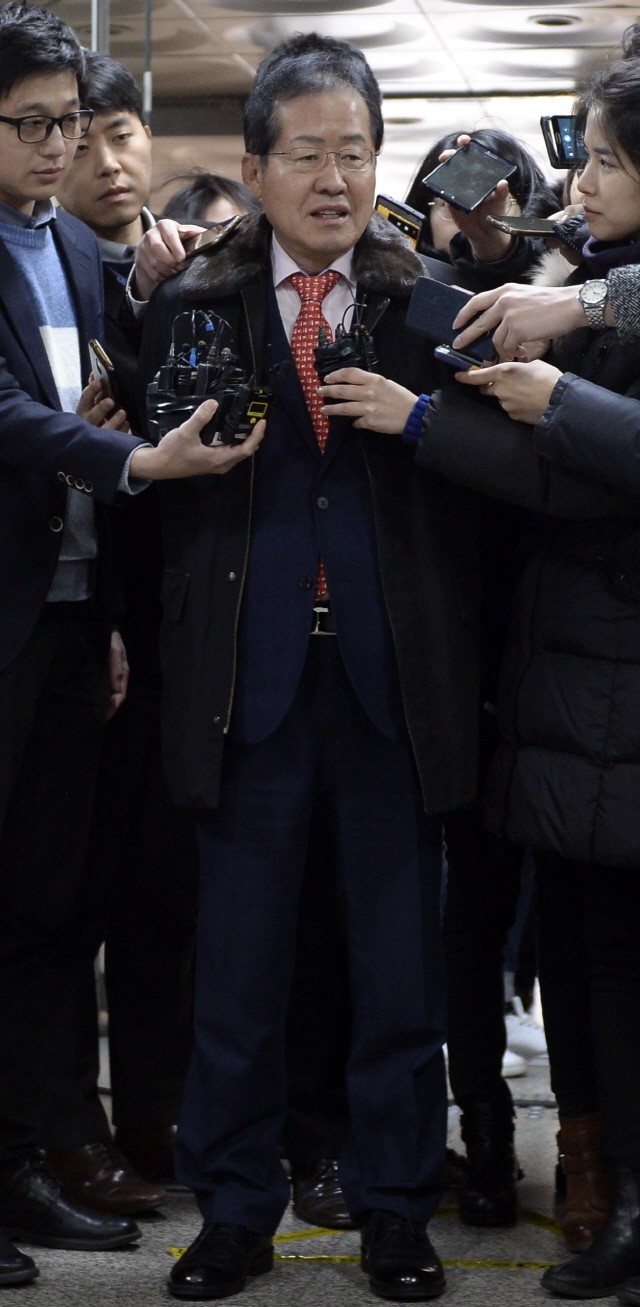 고(故) 성완종 전 경남기업 회장으로부터 불법정치자금을 받은 혐의로 기소된 홍준표 경남도지사가 21일 오전 서초구 서울중앙지법에서 열린 1차 공판에 출석하고 있다.
