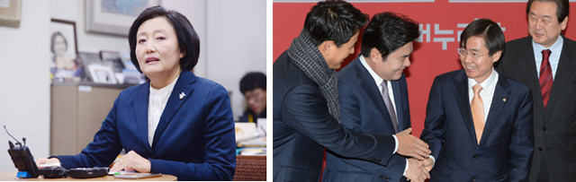 더불어민주당 잔류를 선언한 박영선 의원이 21일 서울 여의도 국회 의원회관 의원실에서 입장을 밝히고 있다(왼쪽). 21일 오전 서울 여의도 국회에서 열린 새누리당 최고위원회의에 앞서 더불어민주당을 탈당하고 새누리당에 입당하는 무소속 조경태 의원이 새누리당 지도부의 환영을 받고 있다.