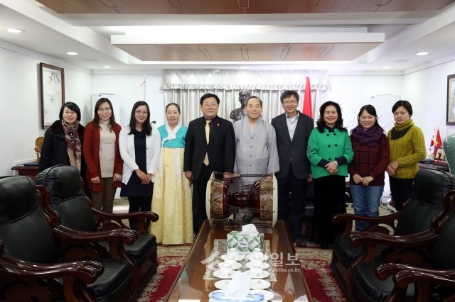 | ▲ 베트남 대사관을 방문한 김복동 의장(왼쪽에서 다섯 번째)이 기념촬영을 하고 있다.(사진제공=종로구의회) | ||